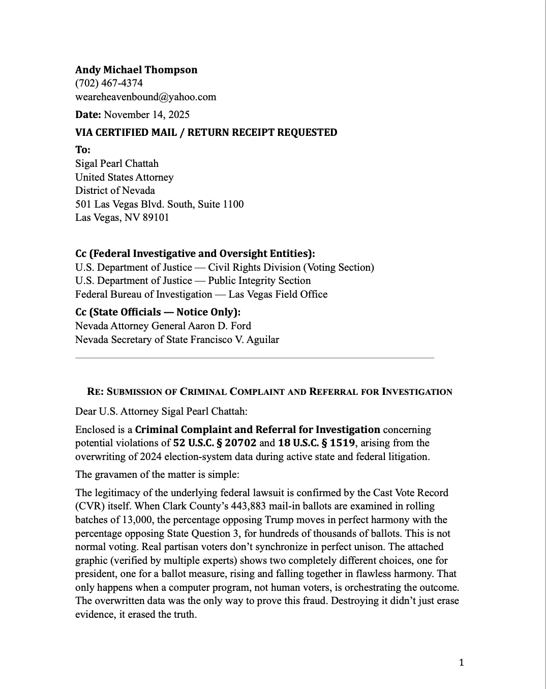 Andy Thompson has been challenging Nevada's 2024 election processes through multiple legal actions, representing himself without an attorney in what's known as a "pro se" case. His efforts have taken him through state and federal courts since late 2024. Thompson's case presents several concerns about Nevada's 2024 election, including missing ballots, destroyed records, and statistical irregularities. After his initial case was dismissed, Thompson filed a criminal referral with the U.S. Attorney's office and continues pursuing his appeals. His cases have drawn public support, including from Fight Voter Fraud. The case remains ongoing in multiple courts, and Thompson continues to press forward with his pro se litigation despite the procedural challenges he has encountered.